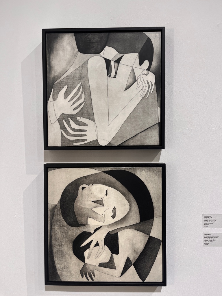 At Froelick Gallery, Rebecca Boraz presents her debut exhibition, “Holding Space.” The concept emerged during the pandemic, a time when our awareness of personal space—whether alone or shared with loved ones—increased to the point of hypersensitivity. This theme resonates deeply in Boraz’s work as a printmaker, where interlocking forms and synchronized lines within confined spaces suggest both tenderness and longing.