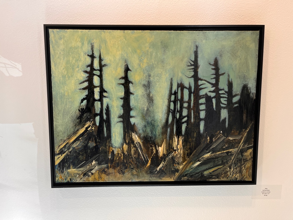 After by Washington State artist Carol Ross depicts the aftermath of a forest fire. The work captures a thick silence, heavy with lingering smoke.