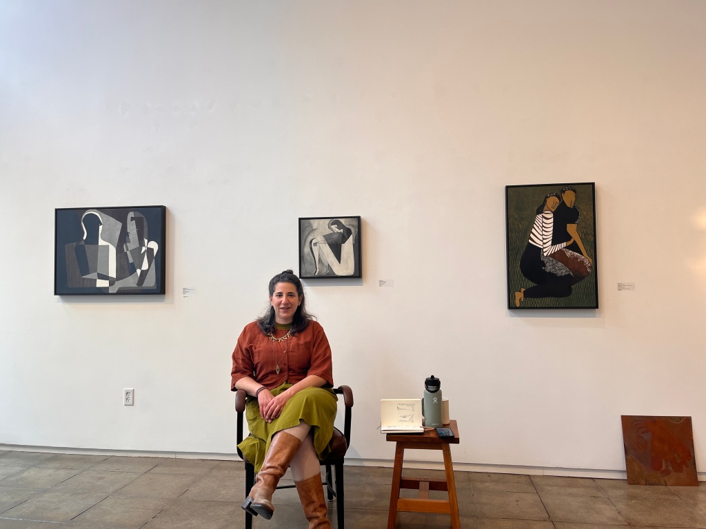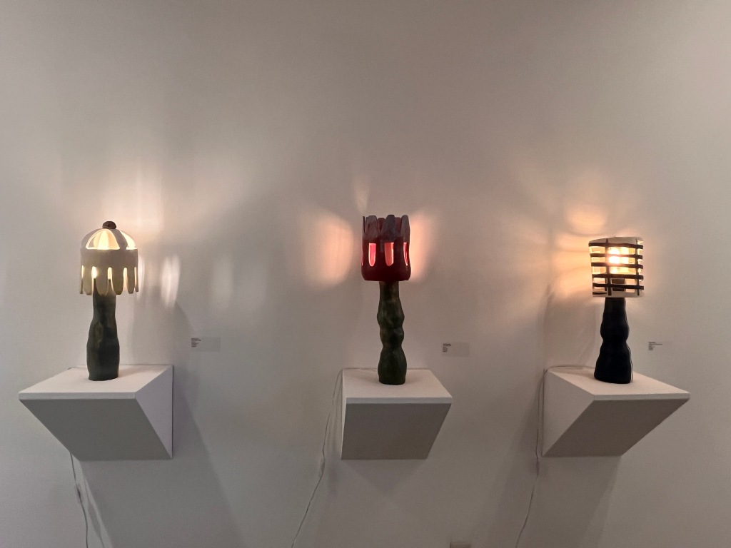 Alongside her prints, Boraz also exhibits a series of sculptural pieces. These ceramic works, functioning as lamps, stand apart from her prints not just in medium but in creative approach. She described the process as liberating, allowing her to work more fluidly compared to the methodical rigor of printmaking. “At last, I can sit up straight to make artwork,” she laughed during the artist talk. The pliability of clay enabled her to make spontaneous choices, resulting in pieces that feel funky, sensual, and intuitive. Despite their playful nature, the anthropomorphic and domestic qualities of these lamps reflect the same artistic vision seen in her prints—suggesting an ongoing dialogue between form, space and human presence.