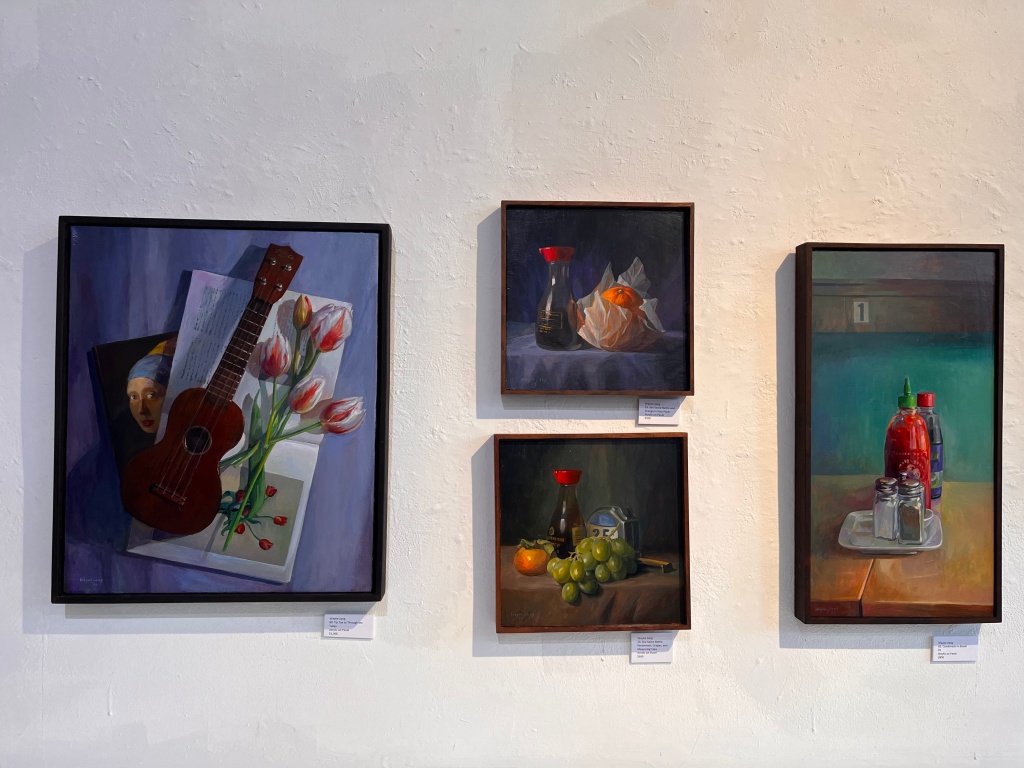 The other category is staged still life. Jiang cites 17th-century Dutch still-life painters as his inspiration. Like Dutch painters, he layers paint with translucent glazing, a feat much harder to achieve in acrylic. Unlike those Dutch Protestants who painted the material culture for the patrons, Jiang favors everyday objects with mundane roots – Donuts, grapes with crackers, oranges with a hot sauce bottle. Even in the Flowers series, one can sense his humor with interesting props he has placed with flowers, like a hammer or a teacup as a container.