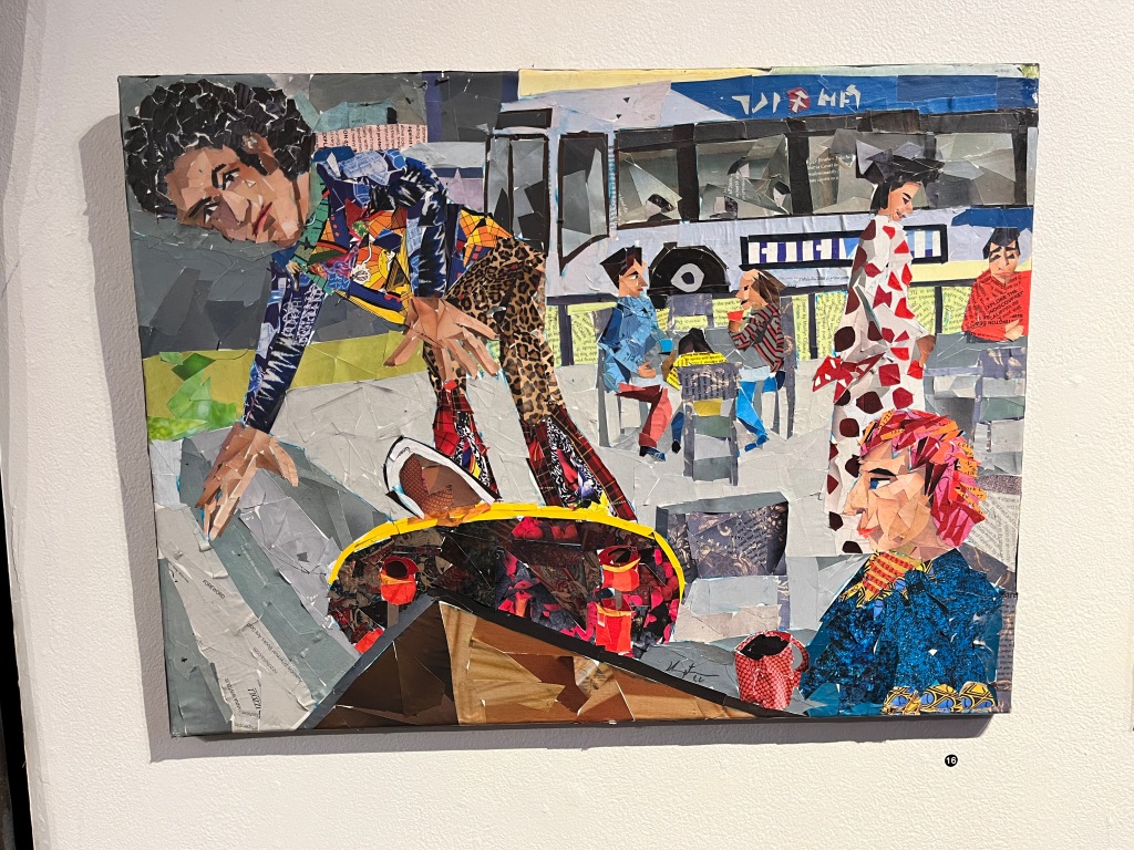 The energy was a little different on the East Side Friday evening when we stopped at AFRU Gallery. On display was work by Hampton Rodriguez and it may seem cliche to say, but the gallery, the vibe, and the artwork provided a triage of breaths of fresh air. Long sketches showing lively street scenes hung above individual works in intricate collages. While the artist says the scenes are contrived, it seems as though they could very well be taking place in Portland neighborhoods. The array of activity and human interaction on display in his work reminded me of Ernie Barnes.