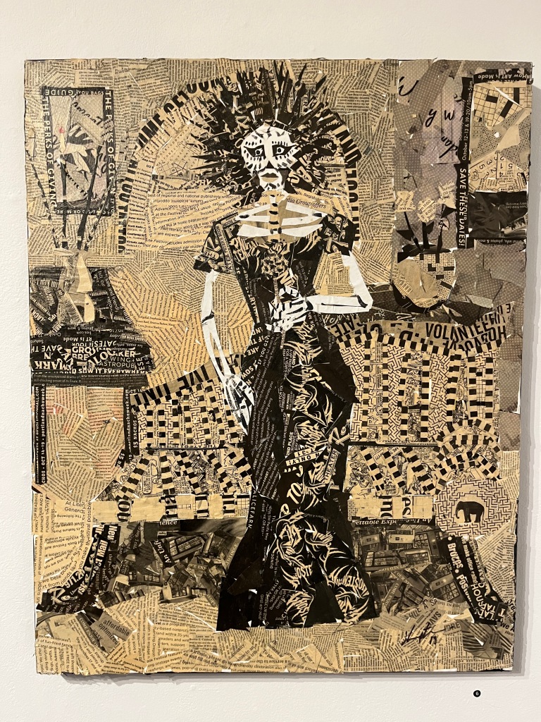 A few skeleton-themed works, including one of a family and a black-and-white work with an intricate assembly of newsprint text, initially lured us in, but the street scenes kept us looking. It did take some time to realize the individual works were based on the long scroll of sketches and then almost didn’t seem right to separate them. Several landscape works were also on view.