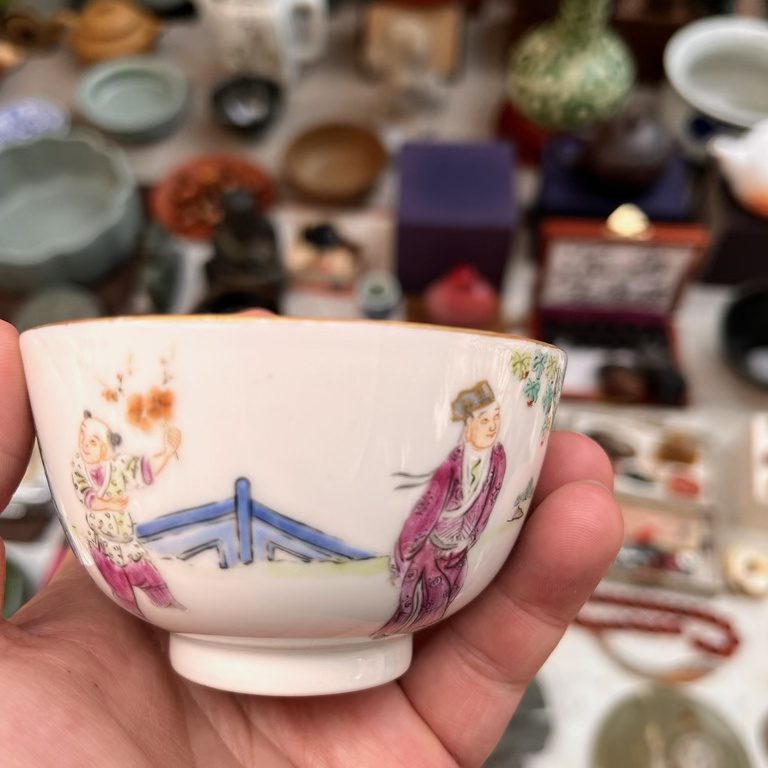 Then I met my nemesis. First, I found the “treasure” of the day. A tiny cup is painted both inside and outside with pastel colors and delicate details. The picture is rather naïve if not crude. But I have found it quite charming with gestural and facial language from figures of different ages and backgrounds. The most amazing part is its thinness. Against the sun, I could almost see light and then realized there were hairline cracks in many places (but none of them were through). All the evidence pointed to a quality commercial kiln before 1900. Then I heard the verdict – “You have good eyes. It is rare. For you, it is 2800 RMB.” That’s just shy of $400. Well, the treasure is definitely not overlooked, but I had to search elsewhere to fit in my budget.