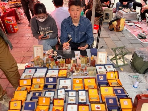 Nearby, a young man was carving custom seals onsite. He offers one for less than seven dollars, including materials and labor. While stamping is not required for daily activities, it is still considered a necessity for Chinese intellectuals and antique collectors. They are like shoes. You cannot just have one. There are usually different ones for different occasions. And the more, the merrier. At the market, he found many potential patrons and was constantly busy answering inquiries and explaining seal design.
