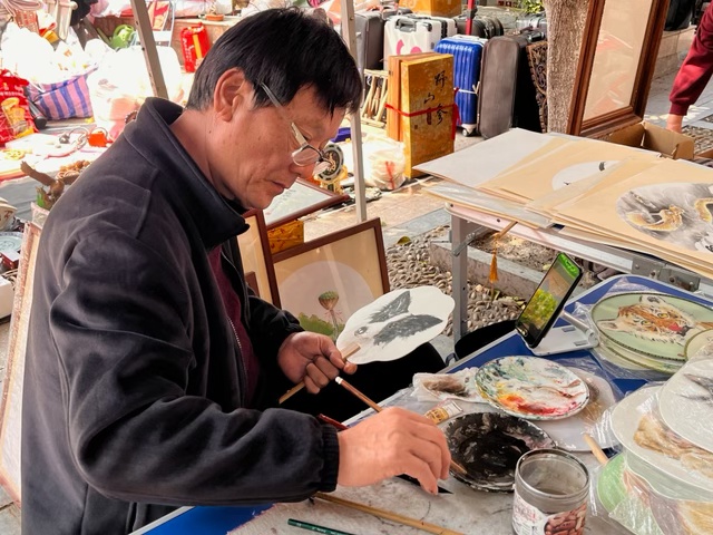 I stopped by Master Ma’s booth because he was painting a commissioned portrait of a bulldog in watercolor, not to be distracted by the crowd. Well, I could not let go of an opportunity to have my dog painted on a fan for around $10! “Your dog is easy, “ said Master Ma, after he connected with me on WeXin (a Chinese version of Facebook) and received a photo of my dog. “I can finish it within an hour. Why don’t you continue strolling?”
