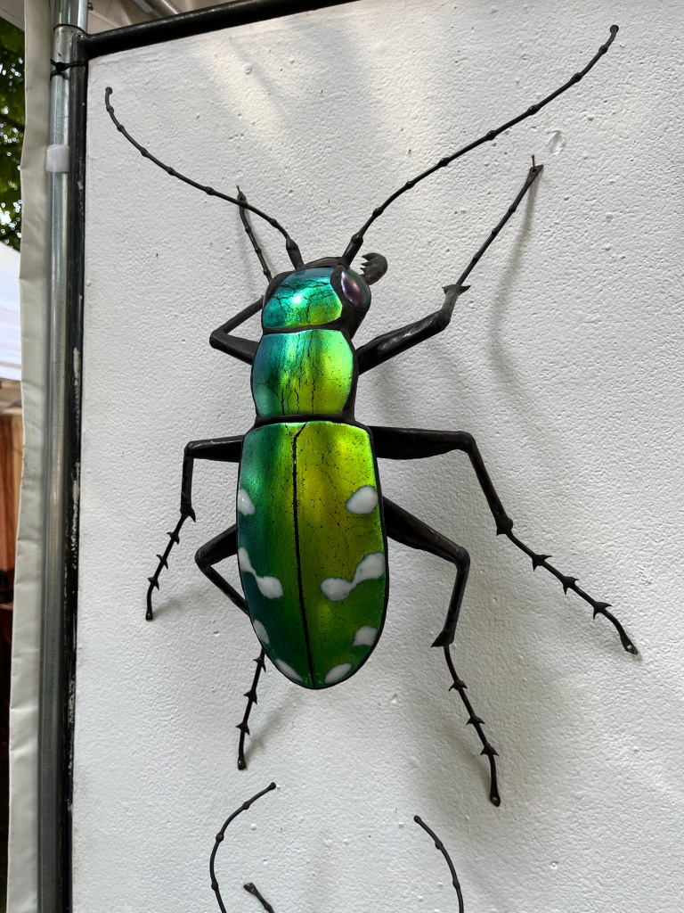 There was a good bit of glass and ceramics at the festival, as well as stone carving and metalwork. We were surprised by Sean Goddard’s insects. Made of metal and glass, those bugs are often enlarged and mixed with real-life detail and artistic imagination. They are at once alarming, eerie, and seductive. Their antennae, elongated and curvy, make them seem much larger. Their wings, made of fused glass, have an iridescent glow.