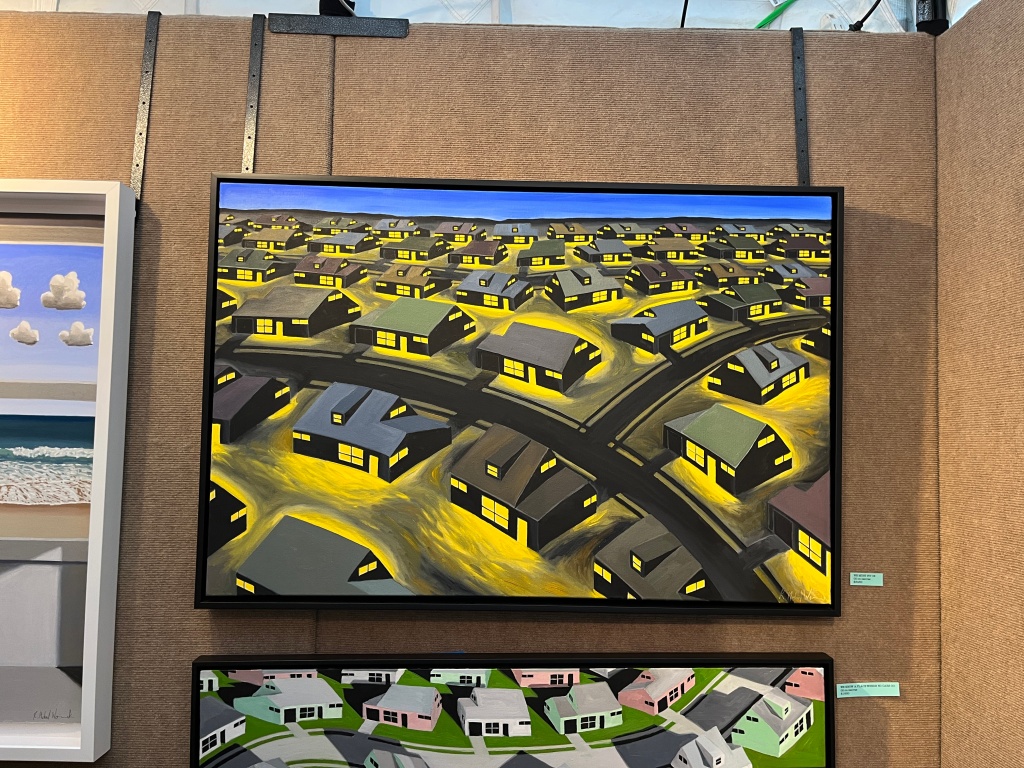 Michael Wommack is one of the few first-time exhibitors in the festival. With roots in his childhood in Levittown, Pennsylvania, he paints a stylized suburban sprawl with a dreamy quality and intensified hues in pastel. In one of the works, houses are lined up just like what they may look today – except all the backyards are connected. “There was a no-fence ordinance. As a kid, we could run from one yard to the next.” That connected patches of grass uniformly lit in bright yellow, delineated by the curvy roads, creating a heightened sense of scale for the neighborhood. Wommack lets viewers inject their own sense and sensibility toward suburban landscapes.