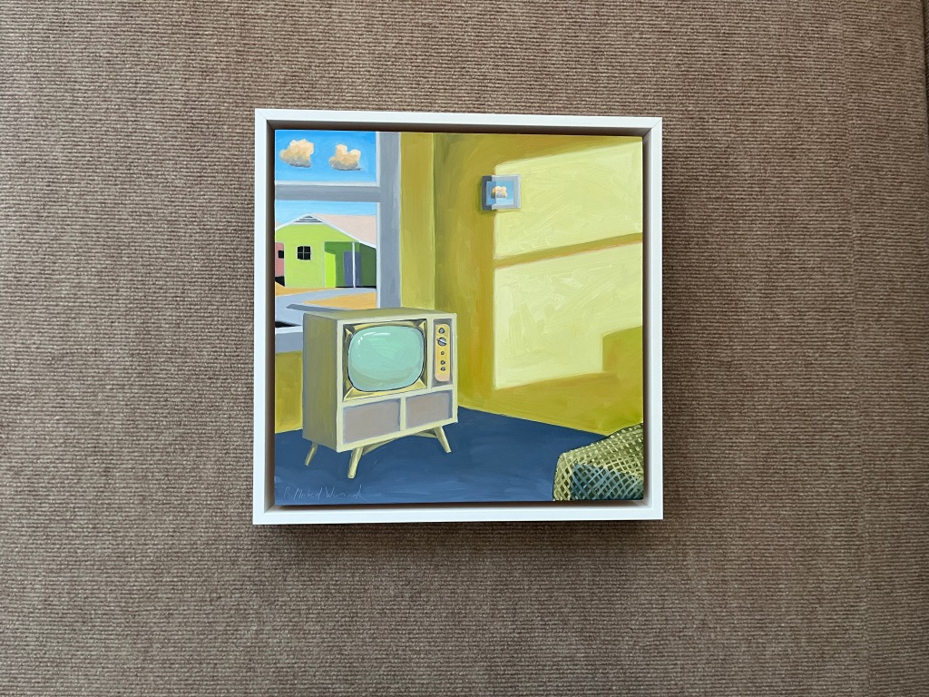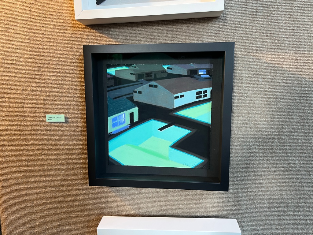 Michael spoke about the colors and the challenges of working with pastels and oil. Many of the images were of imagined interior scenes furnished with vintage sofas and lamps and he visits local antique malls for examples. Particularly striking were works with glowing backyard pools. Certainly, not every home has a pool, but the mind’s eye can help create anything it conjures. The glow is one confined to pastel, however. It pops even when hung in dark hallways and it’s not an effect he’s been able to re-create with oil.
