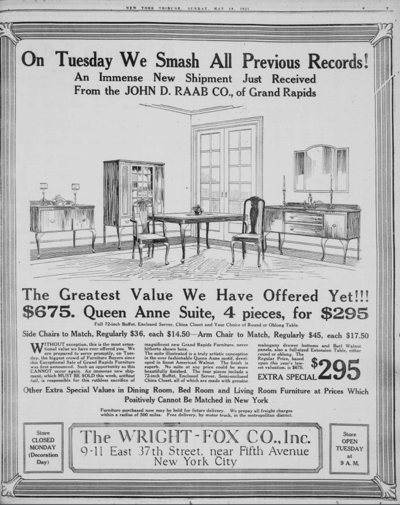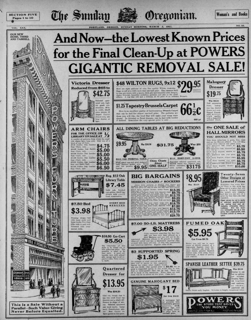 Now an Oregonian ad from 1913 shows more of a neoclassical influence. Note the line items that reference the Empire style as well as the image of the neoclassical sideboard.