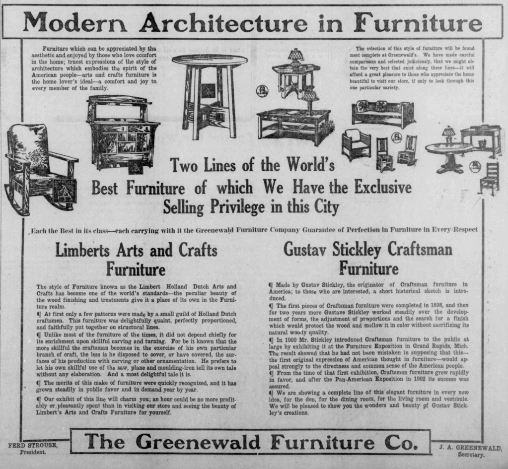 First, a 1910 advertisement from the Herald Republican in Salt Lake City Utah showing Craftsman-style furniture.