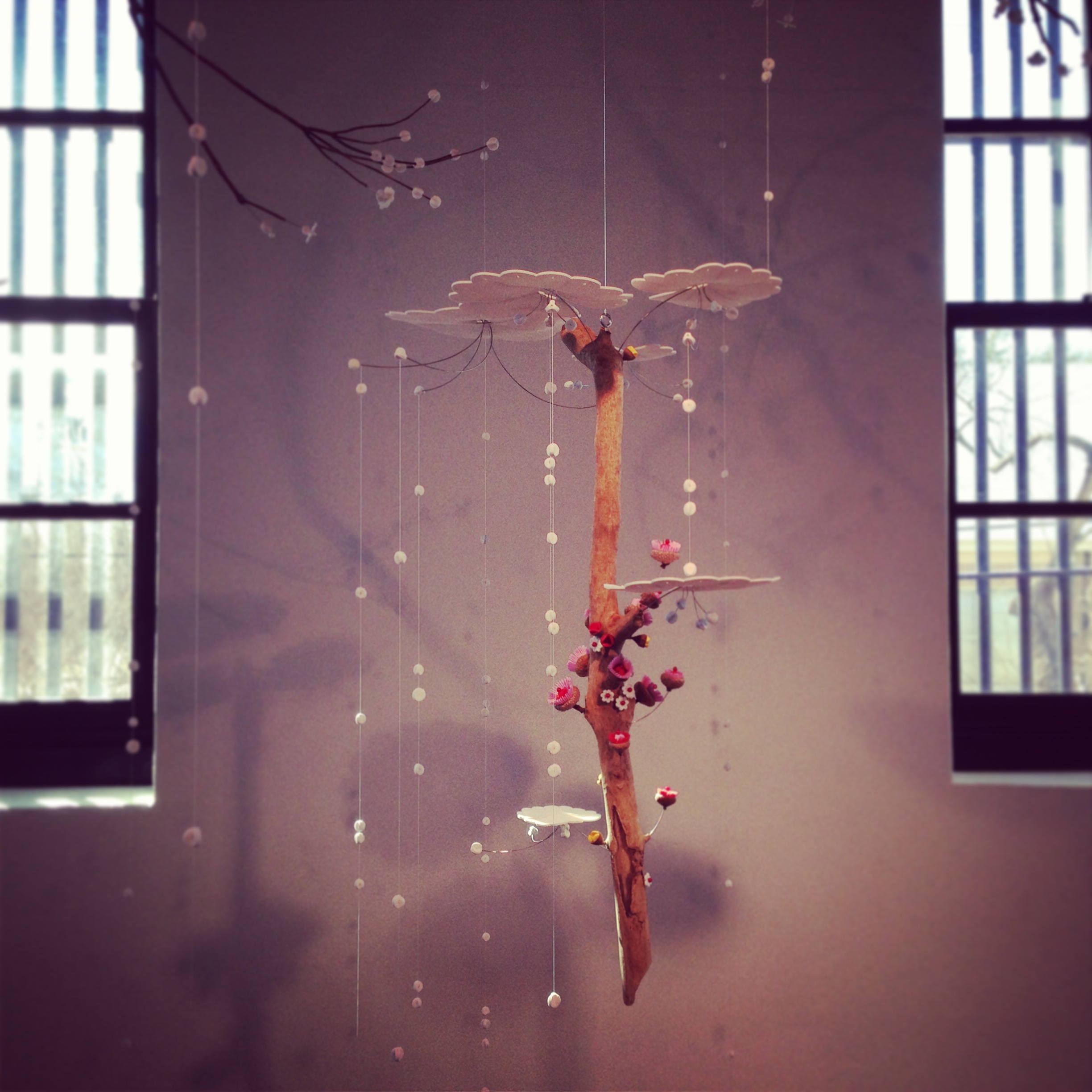 When I walked upstairs and bounced into the blossomed twigs, it triggered the same kind of excitement as seeing solitary flowers of winter jasmine in an early spring excursion (from my childhood in China). Twigs and stems are bare, as are the cases in the installation. Light came through the fenced window and shone on rough-hewed walls. The delicate flowers, like a Calder’s mobile, swung slowly, with a mesmerizing rhythm. Time seemed to have suspended for that momentary quietude.