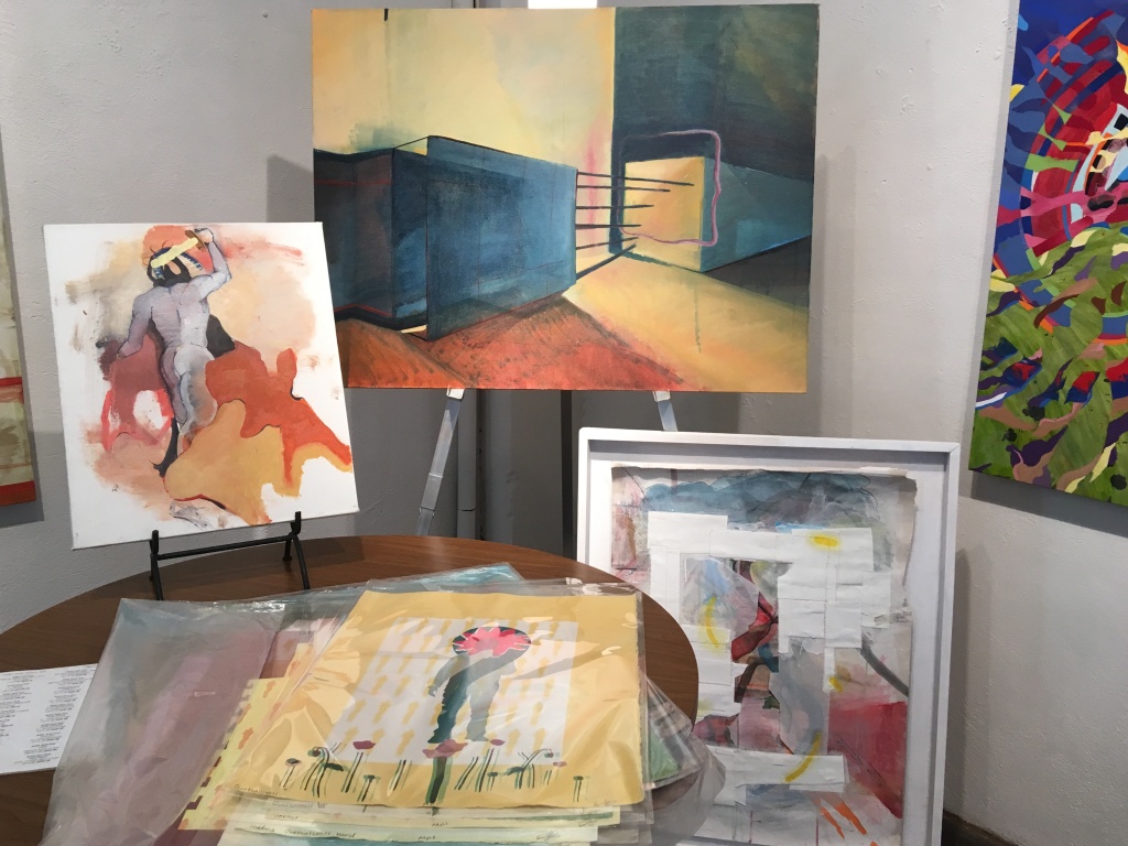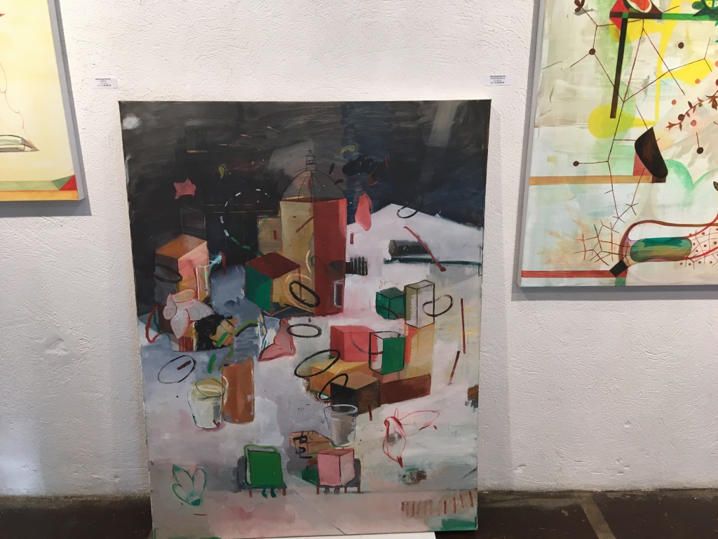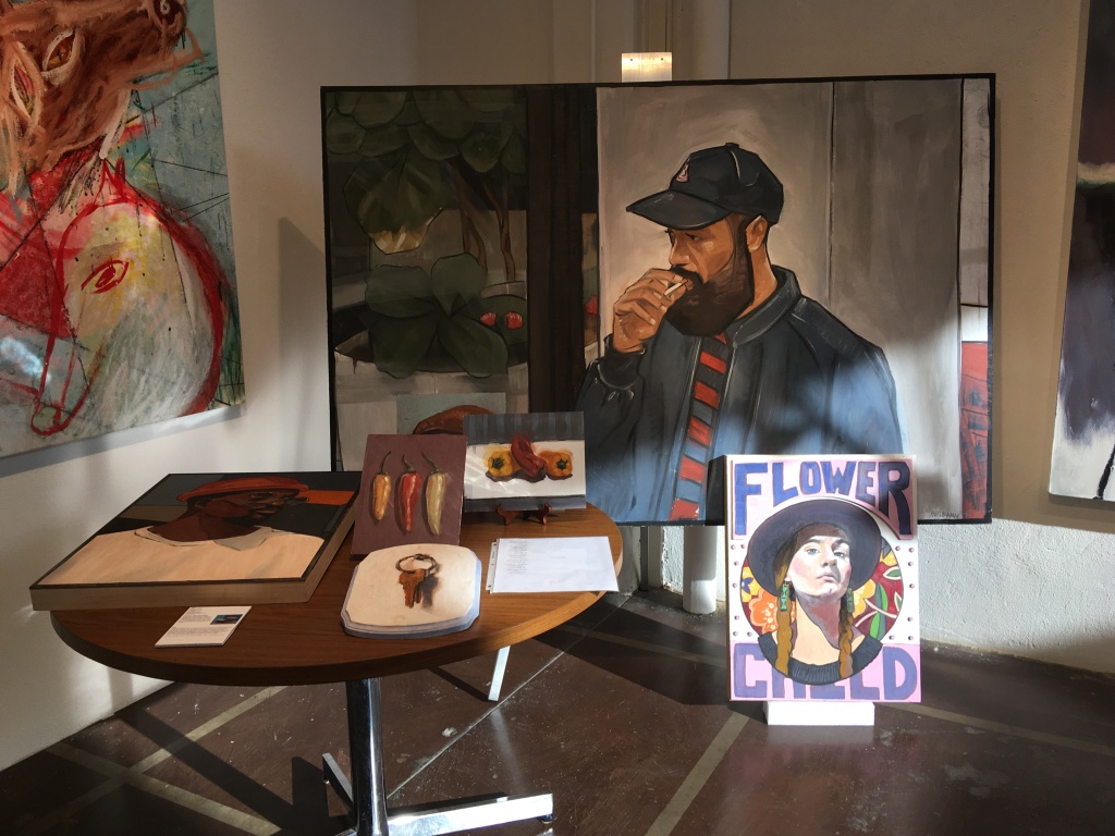 Riley Holloway just completed a solo exhibition at the South Dallas Cultural Center. In that exhibition, he paid homage to Harlem Renaissance. Borrowing compositions including that of Monet, he re-tooled the timeless images of the past with portraits of his circles, stylized in contemporary fashion. As a whole, they are stimulating paintings. One of them is offered in the current show. But I am not totally convinced. What has changed, since the age of Romare Bearden, is our own sense and sensibility. That universality of the human condition re-imagined through a personal narrative of African American culture feels tepid at the best.