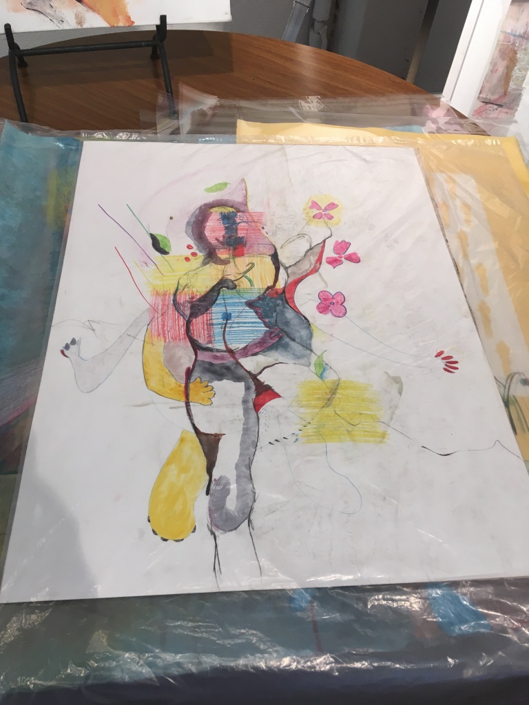 Juan Cruz is still a student at the University of Texas at Dallas. His mono-prints in sequence describe the sorrow and fear imposed by drug cartels. The image, combining poppy flowers, a serpent (in the form of a question mark), and a woman holding a baby, is printed in different colors with added texture, until the violence breaks out, making the rest less perceptible.