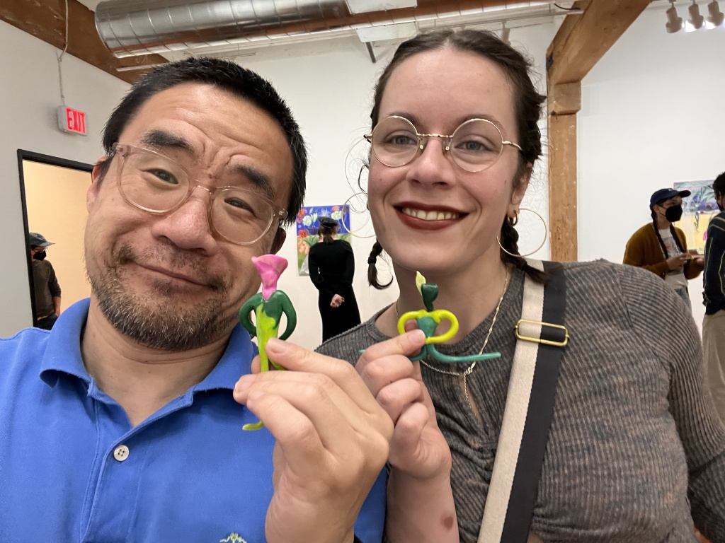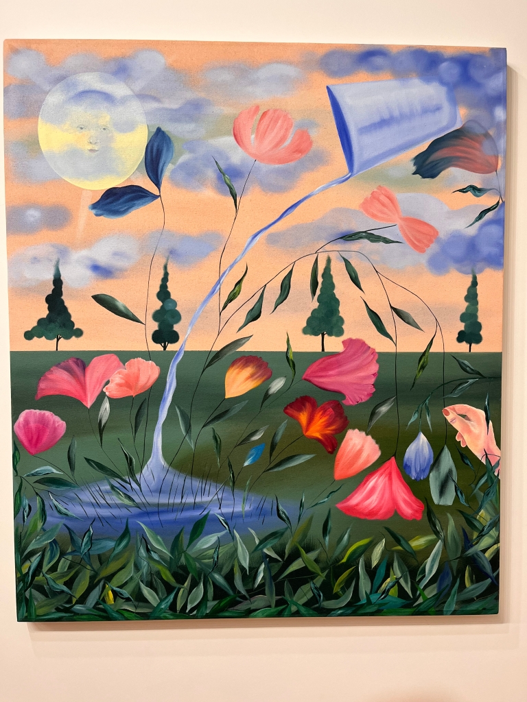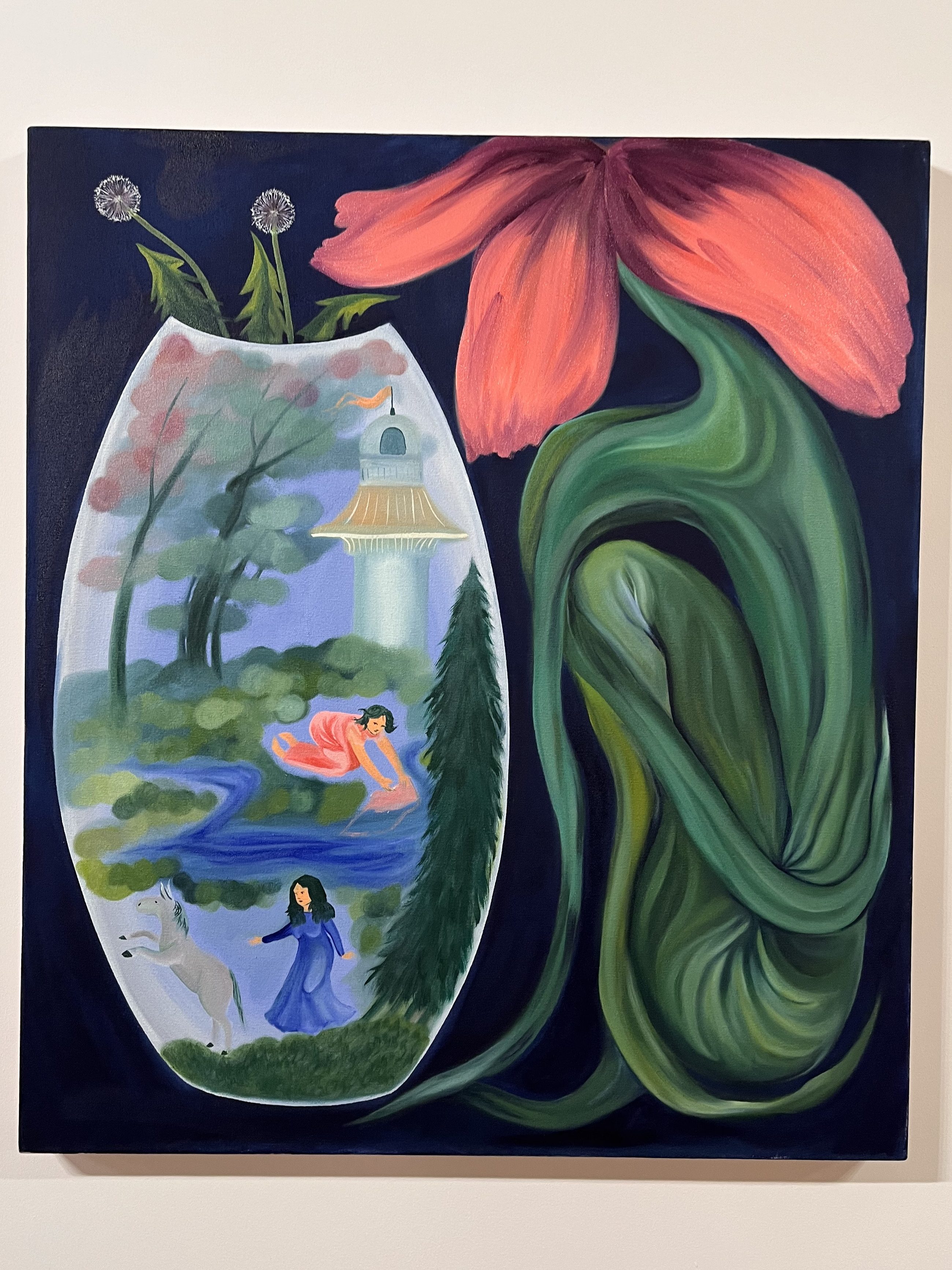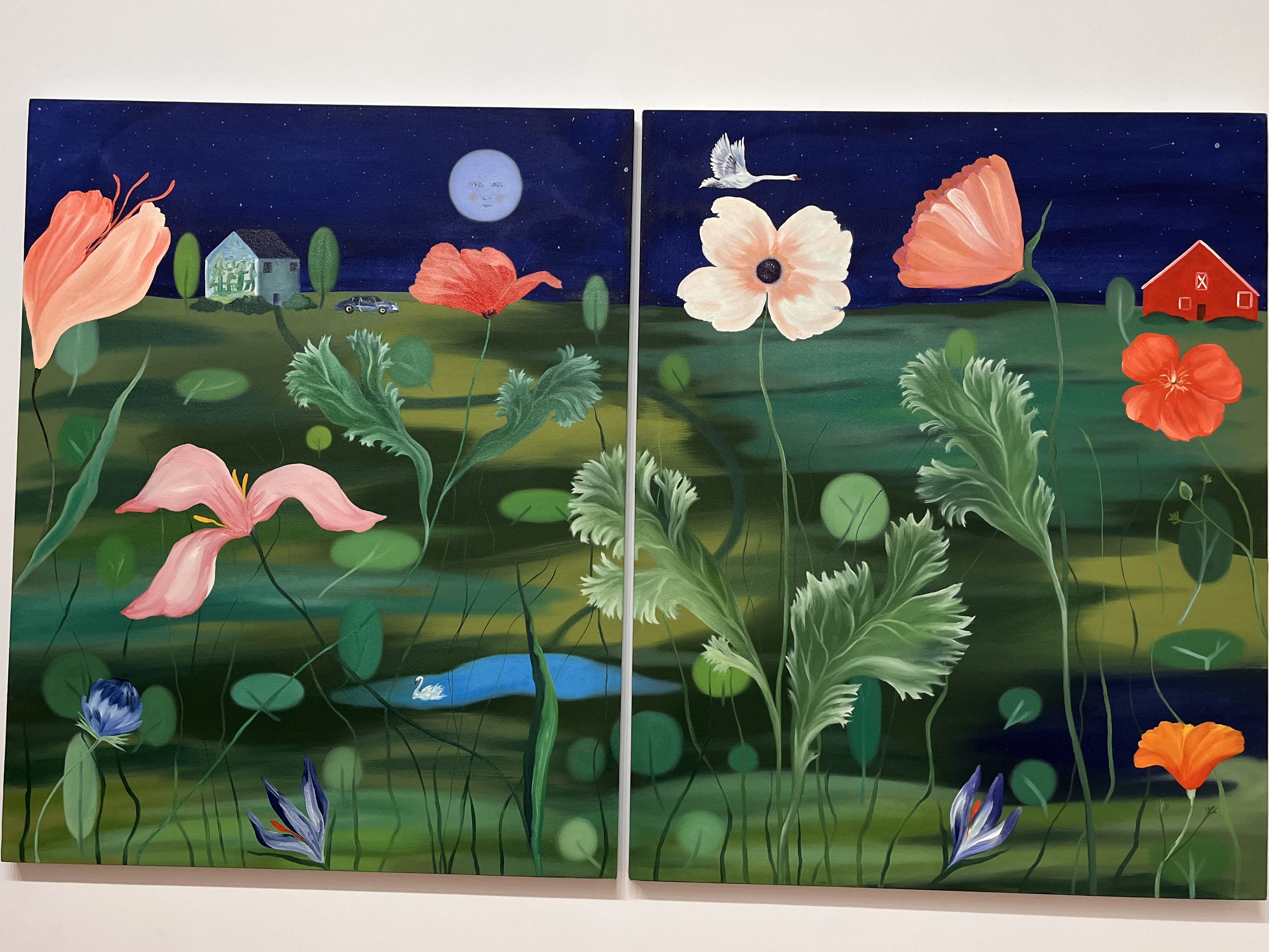 Laura is a native of Portland and currently lives in Brooklyn, New York. It is the removal from the evergreen Pacific Northwest that pushes her toward flowers and plants. “Do you know that research shows that plants can dream?” she asked me. In the diptych painting Nighttime at the Swamp, those plants are more than capable of dreaming. They are like a gang of night-owls engaging in mischievous conversation. On the horizon, we see cars and houses – intervention by humans, that remains in the periphery.