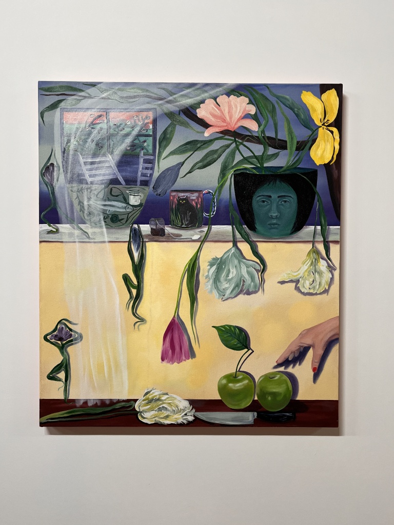 Laura Burke’s new exhibition “The Unseelie Court” at Chefas Projects follows that tradition. Here the florals not only take the center stage, but also take up the world that is mostly dreamy but sometimes psychedelic. Breaking through a notion of “still,” they spring up and dangle down like figures. They intertwine to engage with each other, in a conversation we can’t yet decipher.
